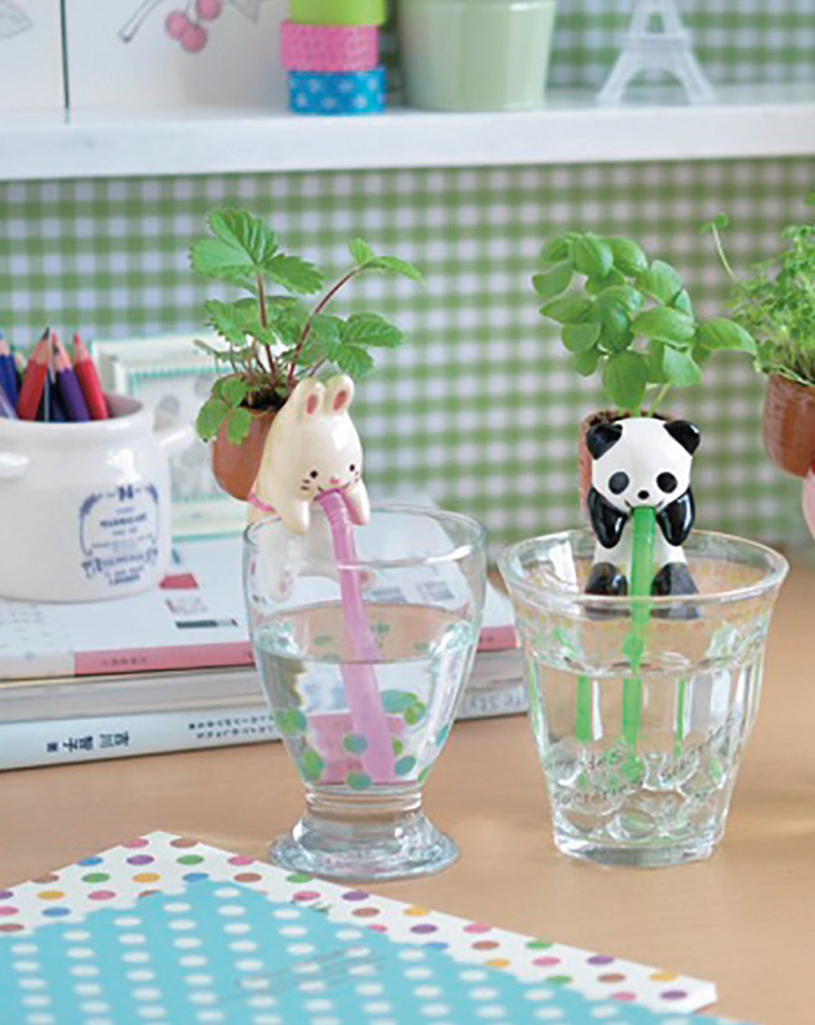 Cute character who likes to drink through a straw. As it sips, water feeds the plant on it’s back. Just hang a Chuppon on the side of a glass and you’ll see cuteness develop. Instructions included.